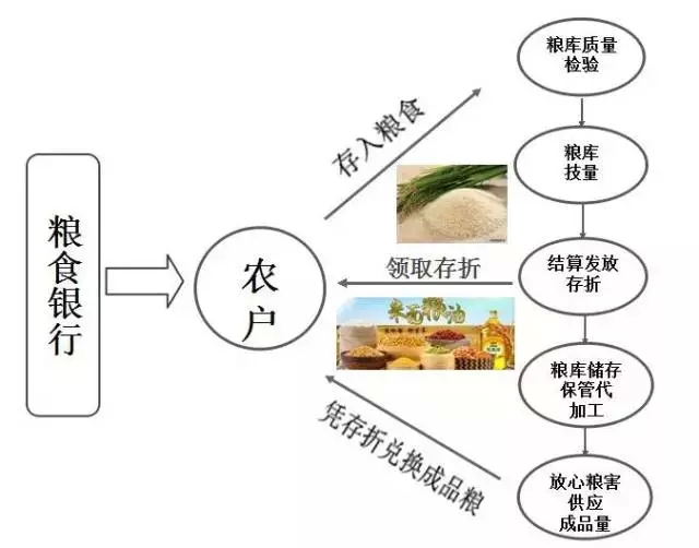 農(nóng)民打下新糧,存入企業(yè)提供的糧倉,定期或活期自由選擇,并且享有利息,這個糧倉就作為“糧食銀行”為農(nóng)戶提供代存代儲代加工糧食等服務(wù),糧食銀行會給農(nóng)戶發(fā)放 “糧食存折”,記錄著存糧日期、數(shù)量、取兌日期和余額等信息。農(nóng)戶還可憑存折在鄉(xiāng)村各個網(wǎng)點兌換米、油或化肥、種子、農(nóng)藥等各種農(nóng)資。農(nóng)戶走進(jìn)糧食銀行,就好像走進(jìn)了商業(yè)銀行的儲蓄所,只不過存取的內(nèi)容從現(xiàn)金變成了糧食。