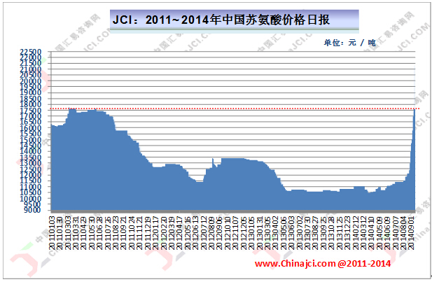據(jù)JCI統(tǒng)計(jì)數(shù)據(jù)顯示,自8月下旬以來,我國蘇氨酸市場價格大漲9500元/噸,上漲幅度為78.51%,截至本周初市場平均價格達(dá)到21600元/噸,部分地區(qū)市場偏高報價為22000-23000元/噸,短期價格以及上漲幅度均為近幾年的最高點(diǎn),詳見下圖所示。